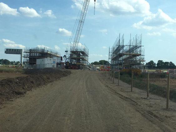 The project team delivering the biggest road upgrade under construction in the UK. Progress is being gained quickly as foundations and bridge columns for some of the project’s 34 new bridges are installed, which alongside our sister company we undertake all RC works on the project’s section two, from 60metre abutments ten metres high, welding tents, edge protection, access and egress across the entire site. We also provided demolition access scaffolds, formwork scaffolds for reinforced concrete piers, access scaffolds into excavations, falsework erection, system staircase access onto bridge decks, site wide edge protection including for excavations and bridge beams and paraslim bracing. All of the work took place adjacent to fully operating motorways.